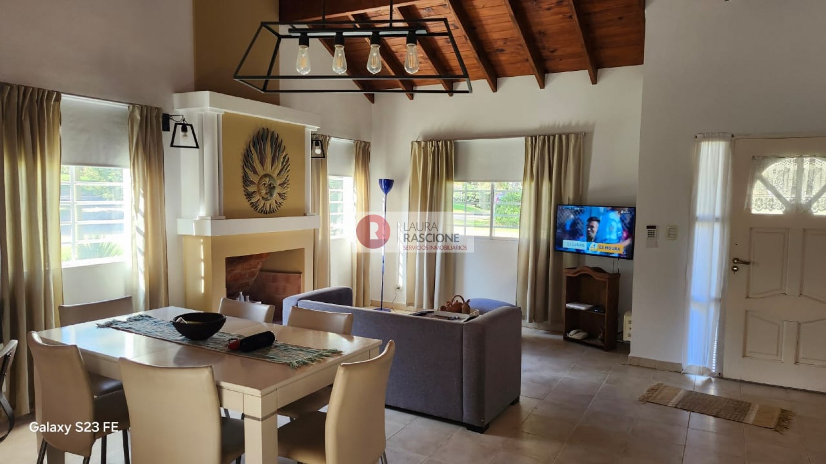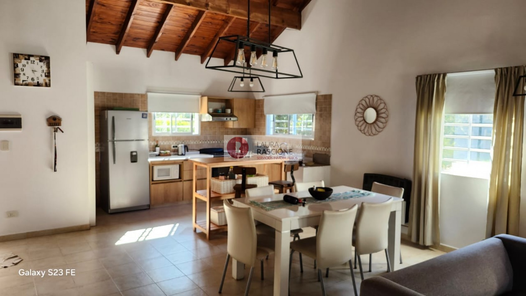 La propiedad se desarrolla en una sola planta y cuenta con un amplio living comedor con hogar a leña. La cocina está integrada y separada del comedor por una práctica barra desayunadora.