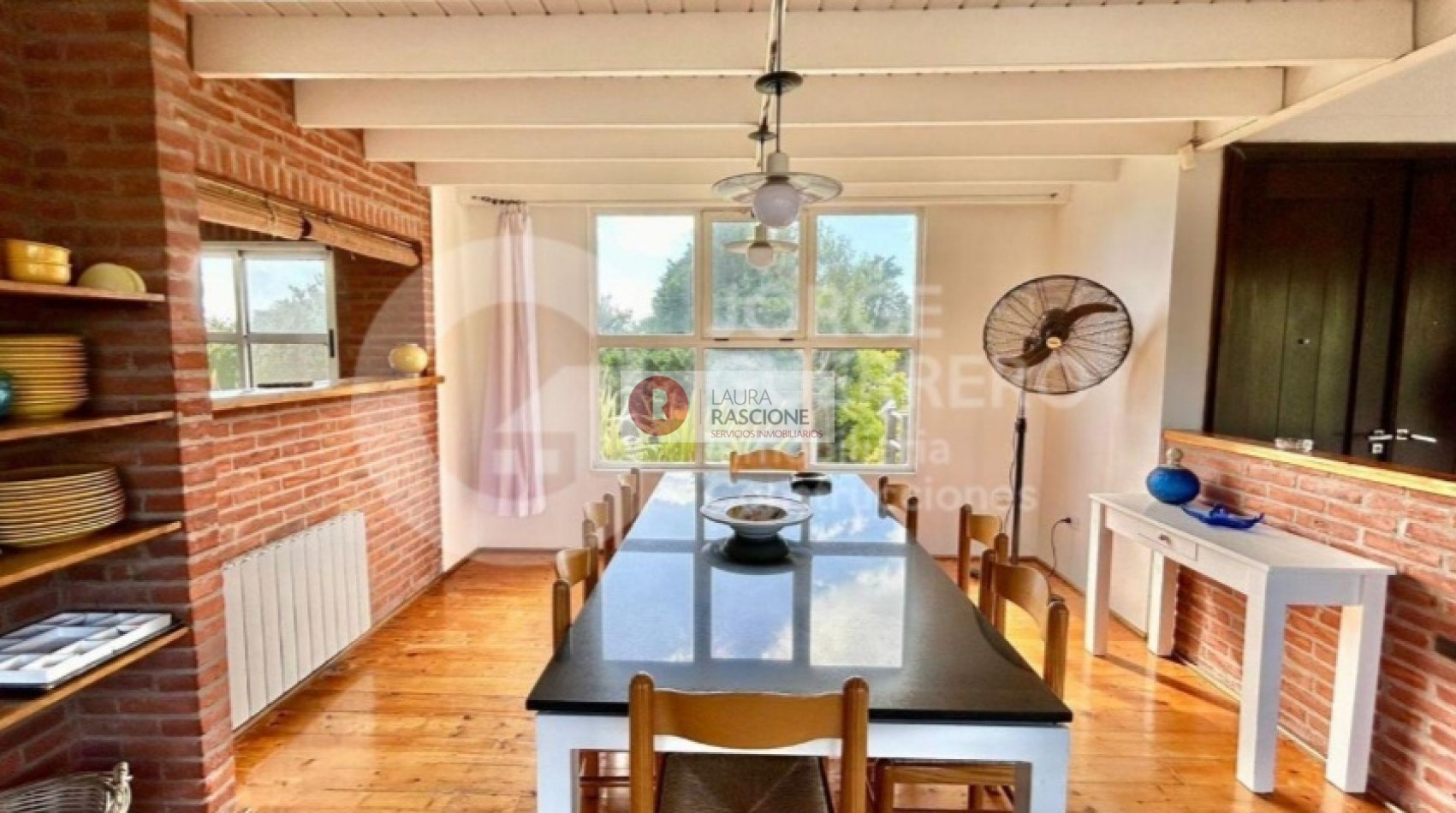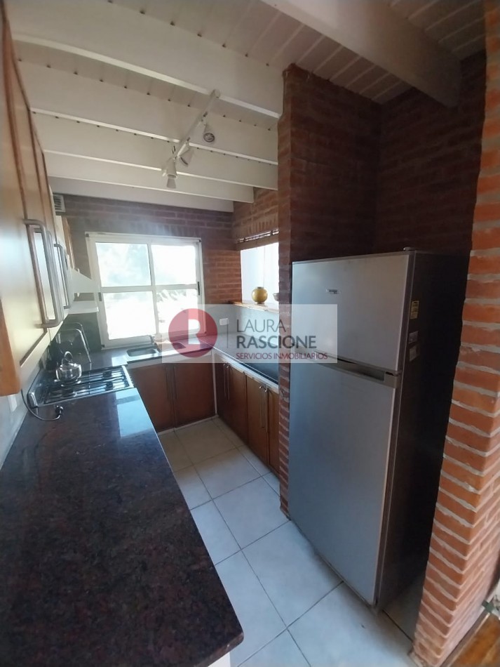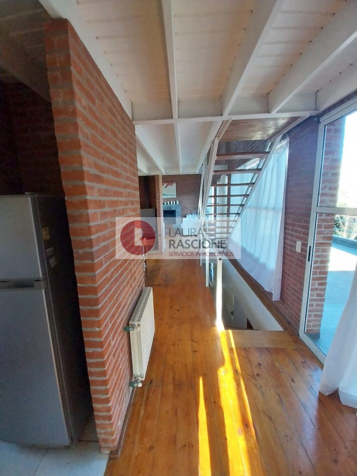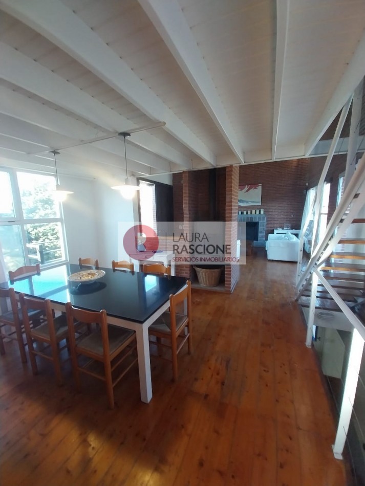 A continuación se encuentra el comedor con una hermosa salamandra de hierro y gran mesa de marmol negro para 8/10 personas, cocina integrada con barra desayunadora, cuarto de servicio,lavadero y baño completo.