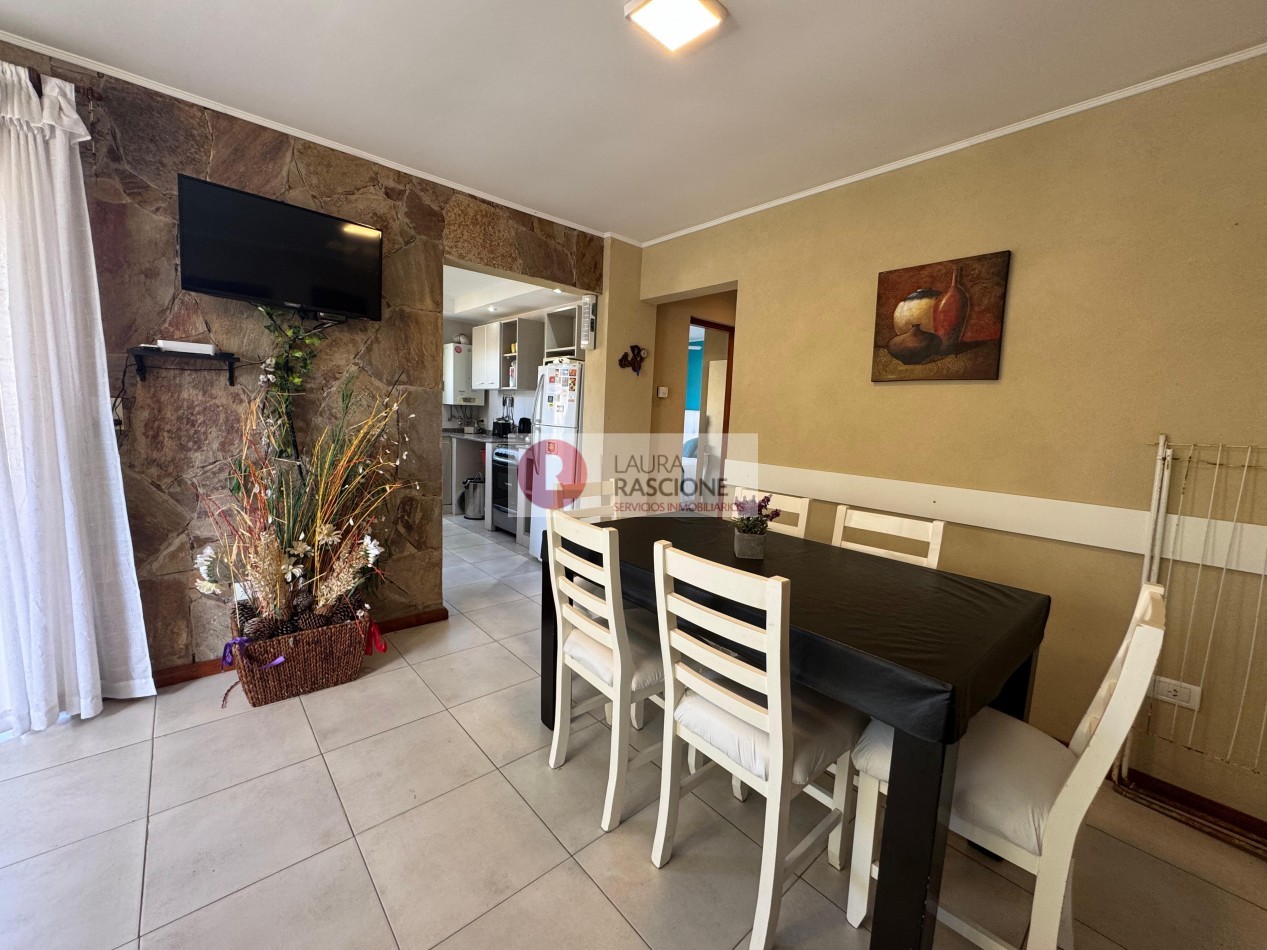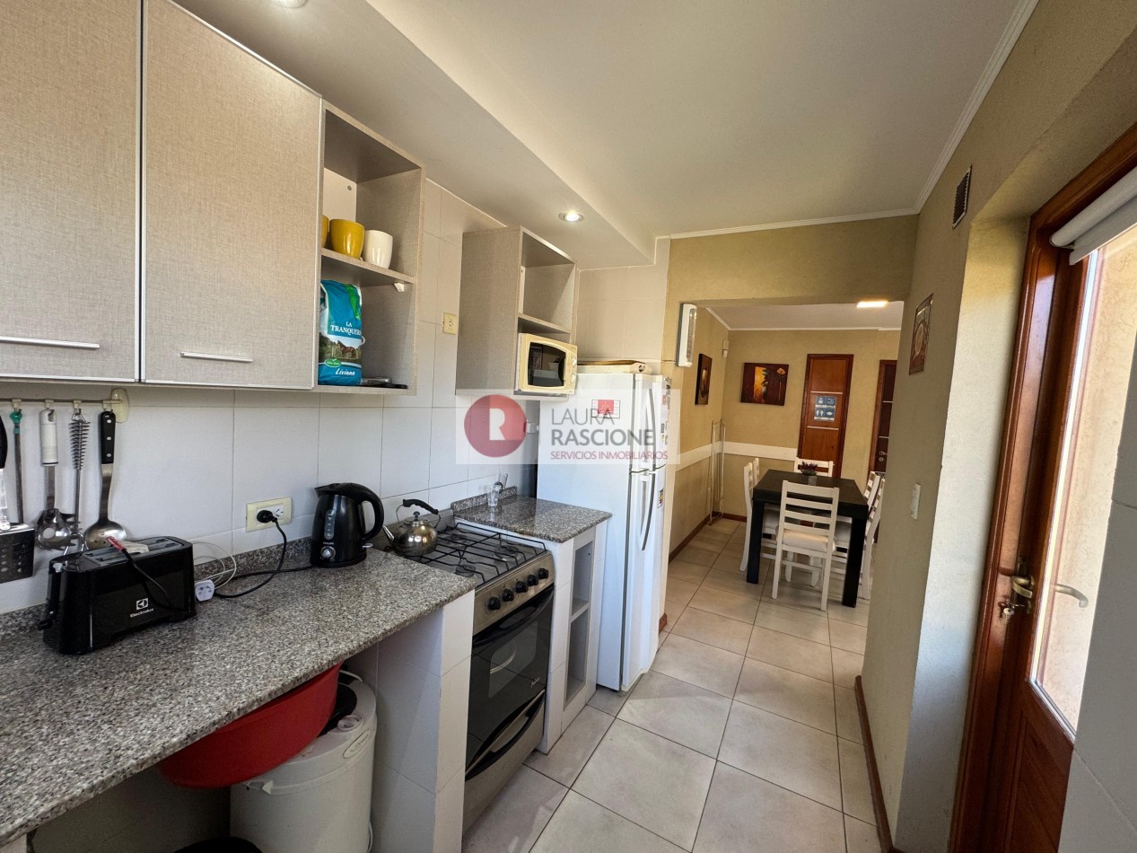 Cocina completa con vajilla y heladera, comedor con mesa y sillas modernas para 6 personas y living con silloncama y otra mas debajo del mismo.